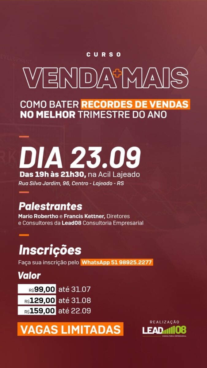 Pensando nisso, a Lead08 Consultoria Empresarial traz o curso VENDA+MAIS – Como bater recordes de vendas no melhor trimestre do ano, ministrado pelos consultores Mario Robertho e Francis Kettner.